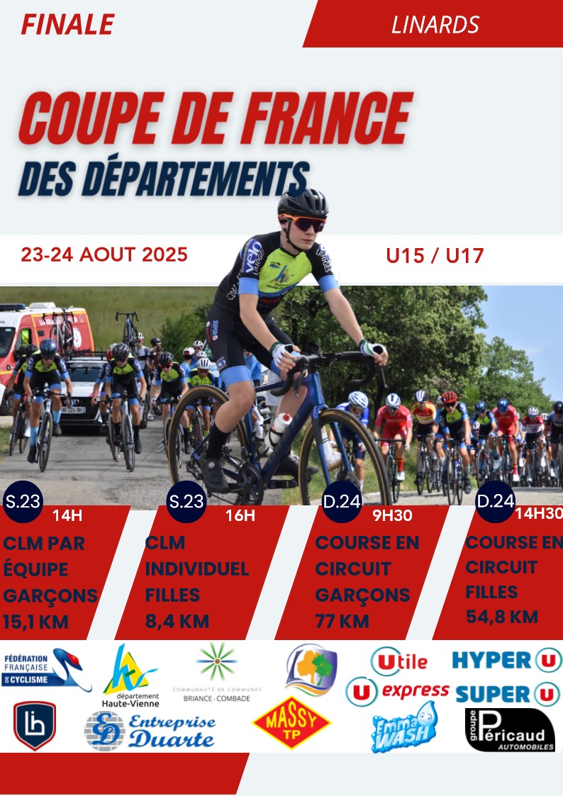 Accueil › Résultats › Résultats - Route Résultats - Route 2025 - Finale de la Coupe de France MU17 & WU17 des Départements à Linars (NOAQ) Publié le dimanche 10 août 2025 Mis à jour le dimanche 24 août 2025 par Frédéric Lafargue Finale de la Coupe de France U17 Femmes des Départements MU 17 - Engagés (V2) WU17 - CLM - RES Général WU17 Jour 1 CDF U17 - Jour 2 - Route + général Finale de la Coupe de France U17 Hommes des Départements Liste des engagées (V2) Horaire provisoire du CLM (V2) MU17 - CLM/EQ - RES Général étape 1 MU17 - Route - Jour 2 - Etape & Gen/EQ Accueil Retour à la rubrique