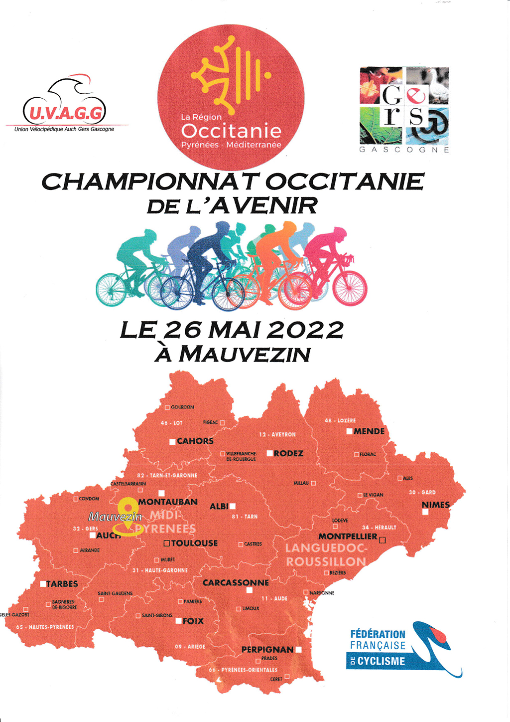 Accueil › Résultats › Résultats - Route Résultats - Route 2022 - Championnat Occitanie Route de l’Avenir - Mauvezin - Gers Publié le mardi 24 mai 2022 Mis à jour le jeudi 13 avril 2023 par Frédéric Lafargue Liste des engagés Juniors Hommes & Séniors Femmes Juniors / Séniors Cadettes Minimes Minimes Femmes Cadets Cadets Accueil Retour à la rubrique