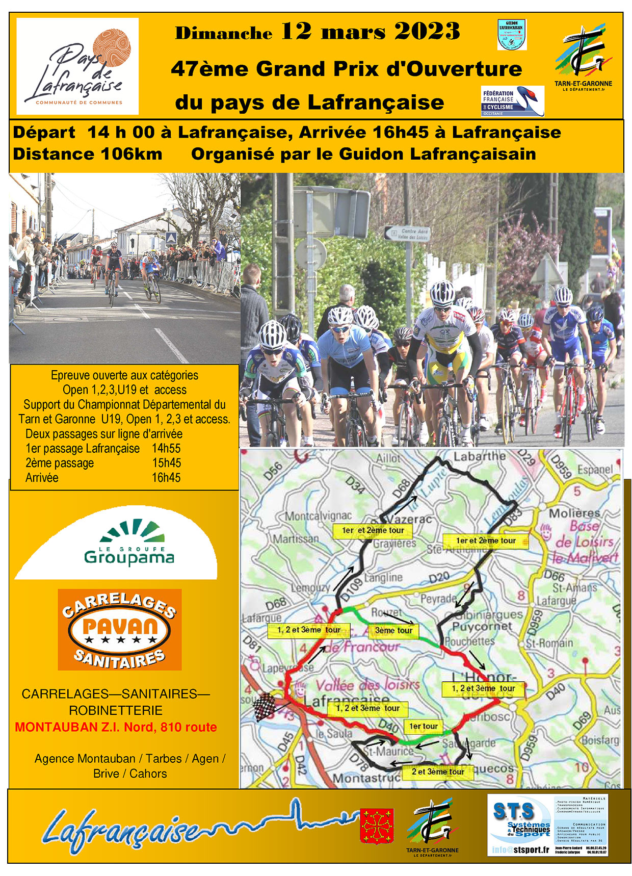 Accueil › Résultats › Résultats - Route Résultats - Route 2023 - 47ème Grand Prix des Coteaux et Plaines du Pays Lafrançaisain Publié le mardi 7 mars 2023 Mis à jour le jeudi 13 avril 2023 par Frédéric Lafargue Livre de Route Liste des engagés MAJ 11/03 17:00 résultats Accueil Retour à la rubrique