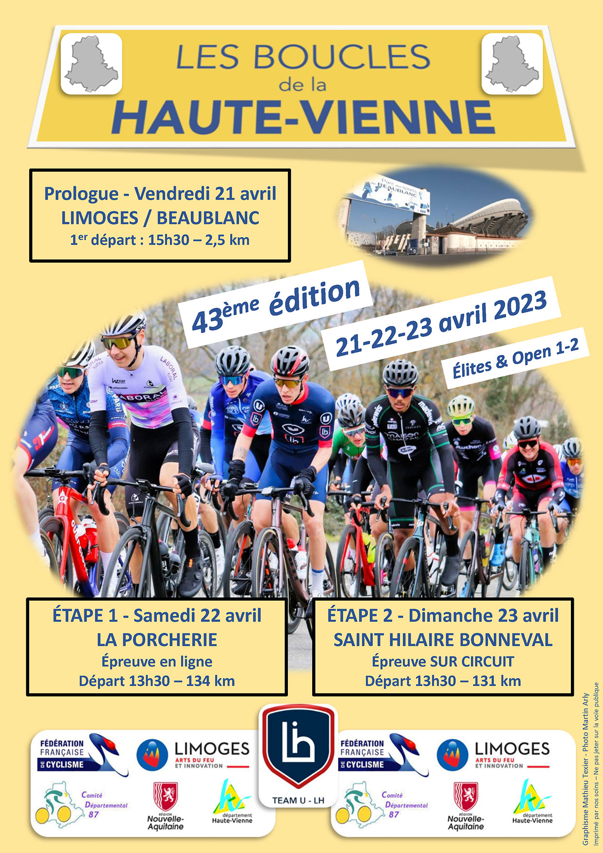 Accueil › Résultats › Résultats - Route Résultats - Route 2023 - Boucles de la Haute Vienne, 43ème édition Publié le samedi 8 avril 2023 Mis à jour le mardi 9 avril 2024 par Frédéric Lafargue Liste des engagés Liste des partants Horaire de départ Prologue à Limoges Beaublanc 1ère étape La Porcherie - La Porcherie 2ème étape Saint-Hilaire-Bonneval Accueil Retour à la rubrique