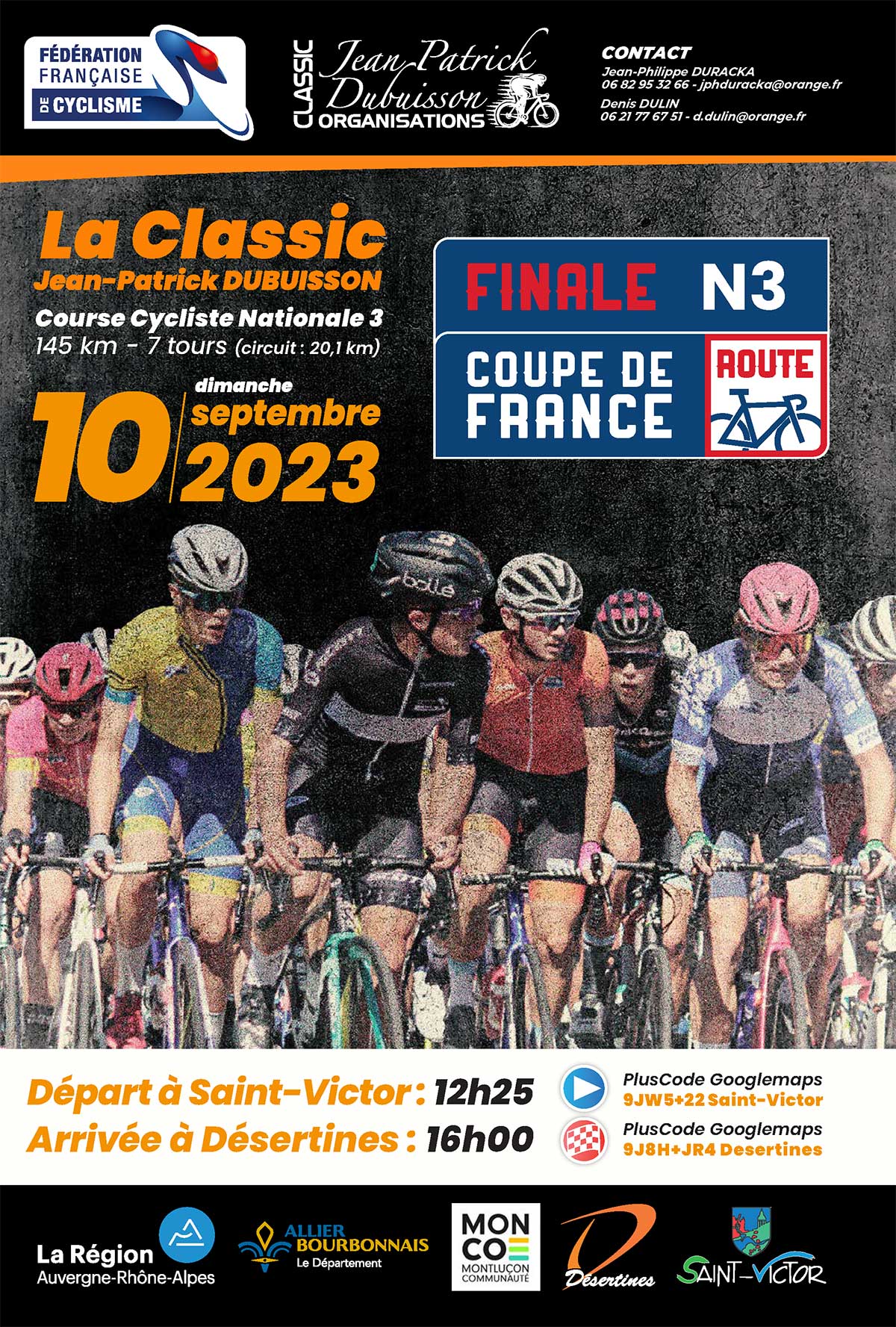 Accueil › Résultats › Résultats - Route Résultats - Route 2023 - Coupe de France des Clubs N3 - M3 - Finale - Classic Jean Patrick Dubuisson Publié le jeudi 7 septembre 2023 Mis à jour le dimanche 10 septembre 2023 par Frédéric Lafargue Liste des Engagés N3 Liste de départ Résultats Complets Liste des Engagés U19 classement U19 Accueil Retour à la rubrique