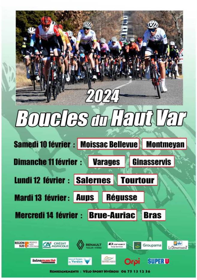 Accueil › Résultats › Résultats - Route Résultats - Route 2024 - Boucles du Haut Var Publié le lundi 5 février 2024 Mis à jour le mercredi 14 février 2024 par Frédéric Lafargue Samedi 10 Février - MOISSAC BELLEVUE - MONTMEYAN Liste de départ - J1 Résultats Jour 1 Dimanche 11 Février - VARAGES - GINASSERVIS Liste de départ - J2 Résultats J2 Lundi 12 Février - SALERNES - TOURTOUR Liste de départ - J3 Résultats J3 Mardi 13 Février - AUPS - REGUSSE Liste de départ - J4 Résultats J4 Mercredi 14 Février - BRUE-AURIAC - BRAS Liste de départ - J5 Résultats J5 Accueil Retour à la rubrique