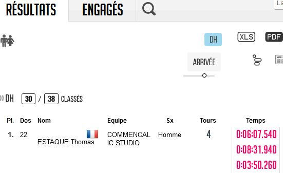 Accueil › Résultats › Résultats - VTT Résultats - VTT 2024 - Monkey Products DH de Millau Publié le samedi 23 mars 2024 Mis à jour le dimanche 31 mars 2024 par Frédéric Lafargue Résultats Complets Live des Essais (cliquer résultats > DH) Accueil Retour à la rubrique