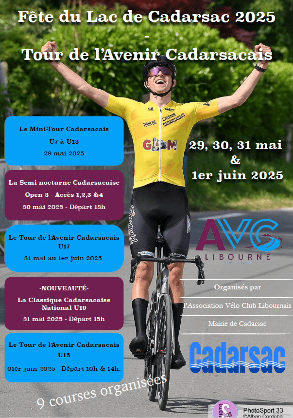 Accueil › Résultats › Résultats - Route Résultats - Route 2025 - Fête du Lac Cadarsac - 3ème Tour de l’Avenir Cadarsacais Publié le mercredi 14 mai 2025 Mis à jour le lundi 9 juin 2025 par Frédéric Lafargue Liste des engagés Horaire de départ U15 Complets U17 Complets Epreuve Fédérale Juniors Résultats MU19 Accueil Retour à la rubrique