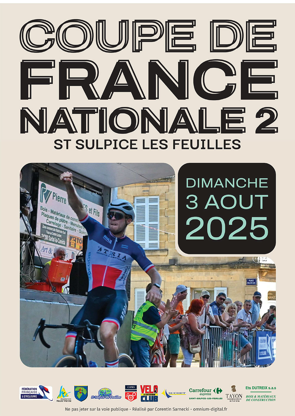 Accueil › Résultats › Résultats - Route Résultats - Route 2025 - Coupe de France des Clubs de National 2 - manche 5 - 3ème Grand Prix de Saint-Sulpice-les-Feuilles Publié le jeudi 3 juillet 2025 Mis à jour le dimanche 3 août 2025 par Frédéric Lafargue Liste des engagés liste des partants Résultats Complets Accueil Retour à la rubrique