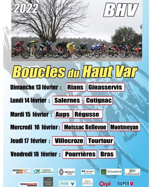 Accueil › Résultats › Résultats - Route Résultats - Route 2022 - Boucles du Haut Var Publié le jeudi 10 février 2022 Mis à jour le vendredi 18 février 2022 par Frédéric Lafargue Dimanche 13 Février - RIANS - GINASSERVIS Partants J1 Résultats Etape 1 Lundi 14 Février - SALERNES - COTIGNAC Partants J2 Résultats Jour 2 Mardi 15 Février - AUPS - REGUSSE Partants J3 Résultats Jour 3 Mercredi 16 Février - MOISSAC BELLEVUE - MONTMEYAN Partants J4 Résultats Jour 4 Jeudi 17 Février - VILLECROZE - TOURTOUR Partants J5 Résultats Jour 5 Vendredi 18 Février - POURRIERES - BRAS Partants J6 Résultats Jour 6 Accueil Retour à la rubrique