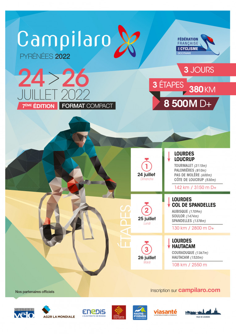Accueil › Résultats › Résultats - Cyclo Sportive Résultats - Cyclo Sportive 2022 - la Campilaro - Cyclosportive à étape Publié le vendredi 22 juillet 2022 Mis à jour le jeudi 13 avril 2023 par Frédéric Lafargue 1ère étape Lourdes - Tourmalet - Côte de Loucrup - Lourdes 2ème étape Lourdes - Col de l’Aubisque - Col de Spandelles 2ème étape Lourdes - Couraduque - Hautacam Accueil Retour à la rubrique