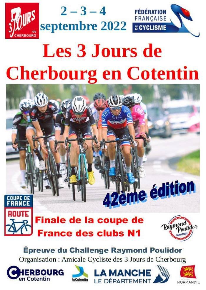 Accueil › Résultats › Résultats - Route Résultats - Route 2022 - Coupe de France des Clubs de National 1 - Manche 5 - 3 jours de Cherbourg en Cotentin Publié le mercredi 31 août 2022 Mis à jour le jeudi 13 avril 2023 par Frédéric Lafargue Liste des Engagés Liste des partants 1ère étape Bretteville-en-saire - Port-Bail-sur-Mer 3ème étape Tourlaville - Cherbourg 3ème étape Tourlaville - Cherbourg - Coupe Accueil Retour à la rubrique