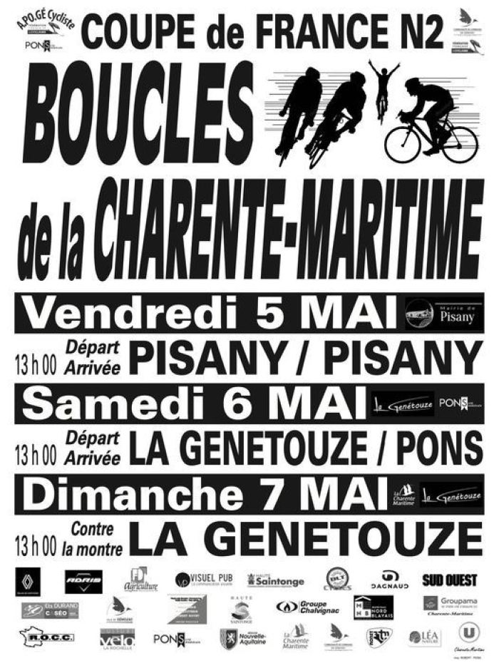 Accueil › Résultats › Résultats - Route Résultats - Route 2023 - Coupe de France des Clubs N2 - M2 - Les Boucles de la Charente Maritime Publié le mercredi 12 avril 2023 Mis à jour le dimanche 7 mai 2023 par Frédéric Lafargue Liste des engagés Liste des partants 1ère étape Pisany - Pisany 2ème étape la Genétouze - Pons 3ème étape CLM à la Génétouze Accueil Retour à la rubrique