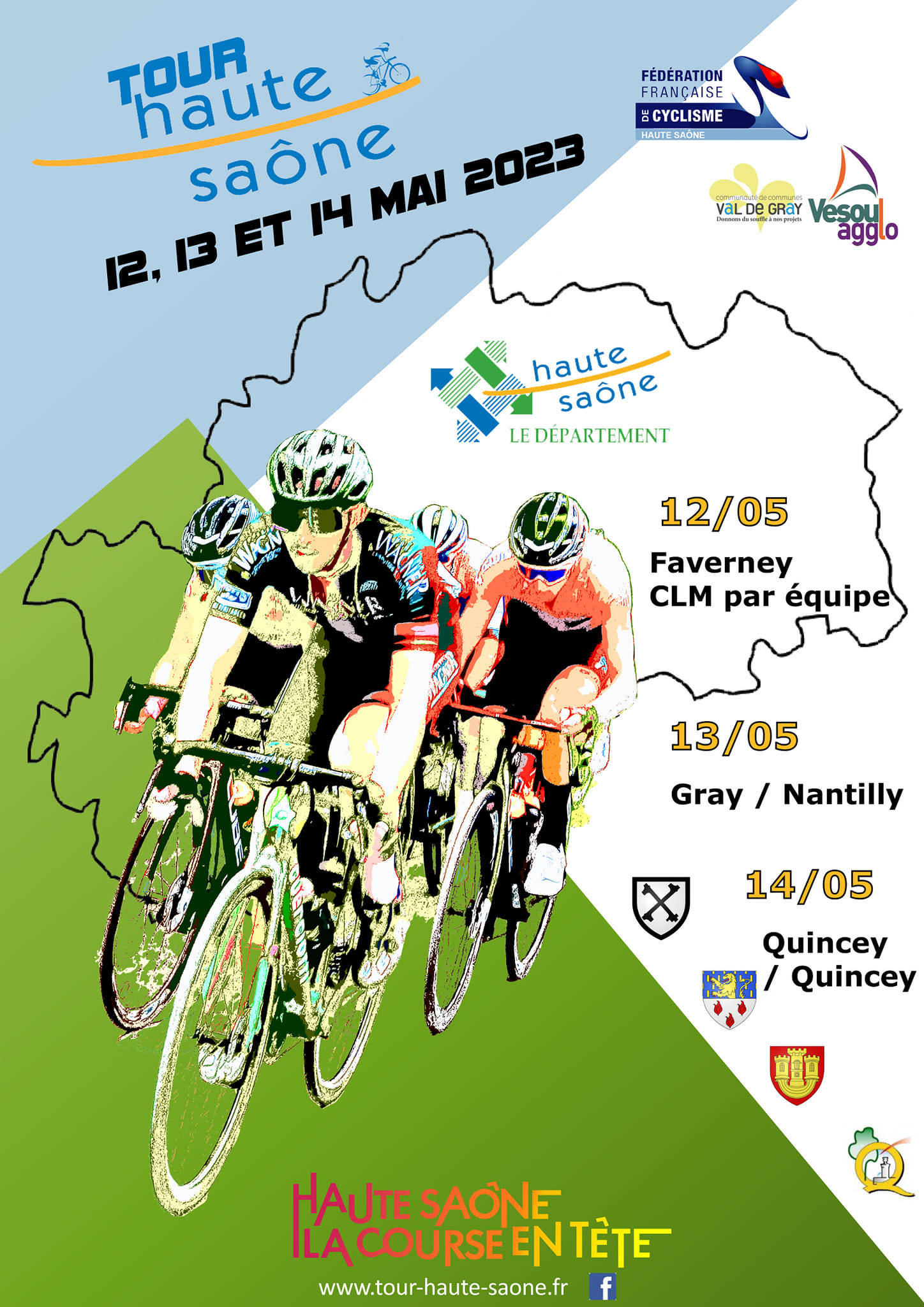 Accueil › Résultats › Résultats - Route Résultats - Route 2023 - Tour de la Haute Saône Publié le vendredi 28 avril 2023 Mis à jour le dimanche 14 mai 2023 par Frédéric Lafargue Liste des engagés Horaire de départ du CLM/EQ 1ère étape CLM-EQ à Faverney 2ème étape Gray - Nantilly 3ème étape Quincey - Quincey.pdf Accueil Retour à la rubrique