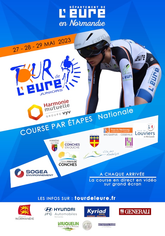 Accueil › Résultats › Résultats - Route Résultats - Route 2023 - Tour de l’Eure Juniors Publié le mercredi 17 mai 2023 Mis à jour le lundi 29 mai 2023 par Frédéric Lafargue Liste des Partants 1ère étape Ferrière-sur-Risle - Conches-en-Ouche 2ème étape Gisors - Les Andelys 3ème étape Bacquepuis - Cesseville (CLM-EQ) 4ème étape Le Neubourg - Louviers Accueil Retour à la rubrique