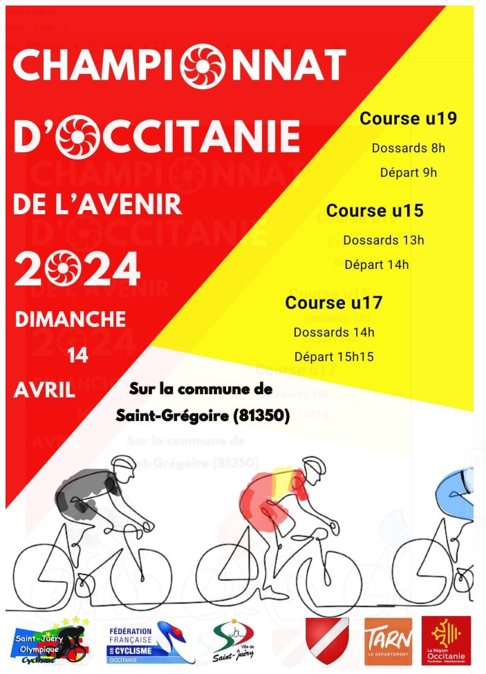 Accueil › Résultats › Résultats - Route Résultats - Route 2024 - Championnat Occitanie Route de l’Avenir - Saint Grégoire (81350) Publié le samedi 6 avril 2024 Mis à jour le dimanche 14 avril 2024 par Frédéric Lafargue Liste des engagés Résultats U15 Résultats U17 Résultats U19 Accueil Retour à la rubrique