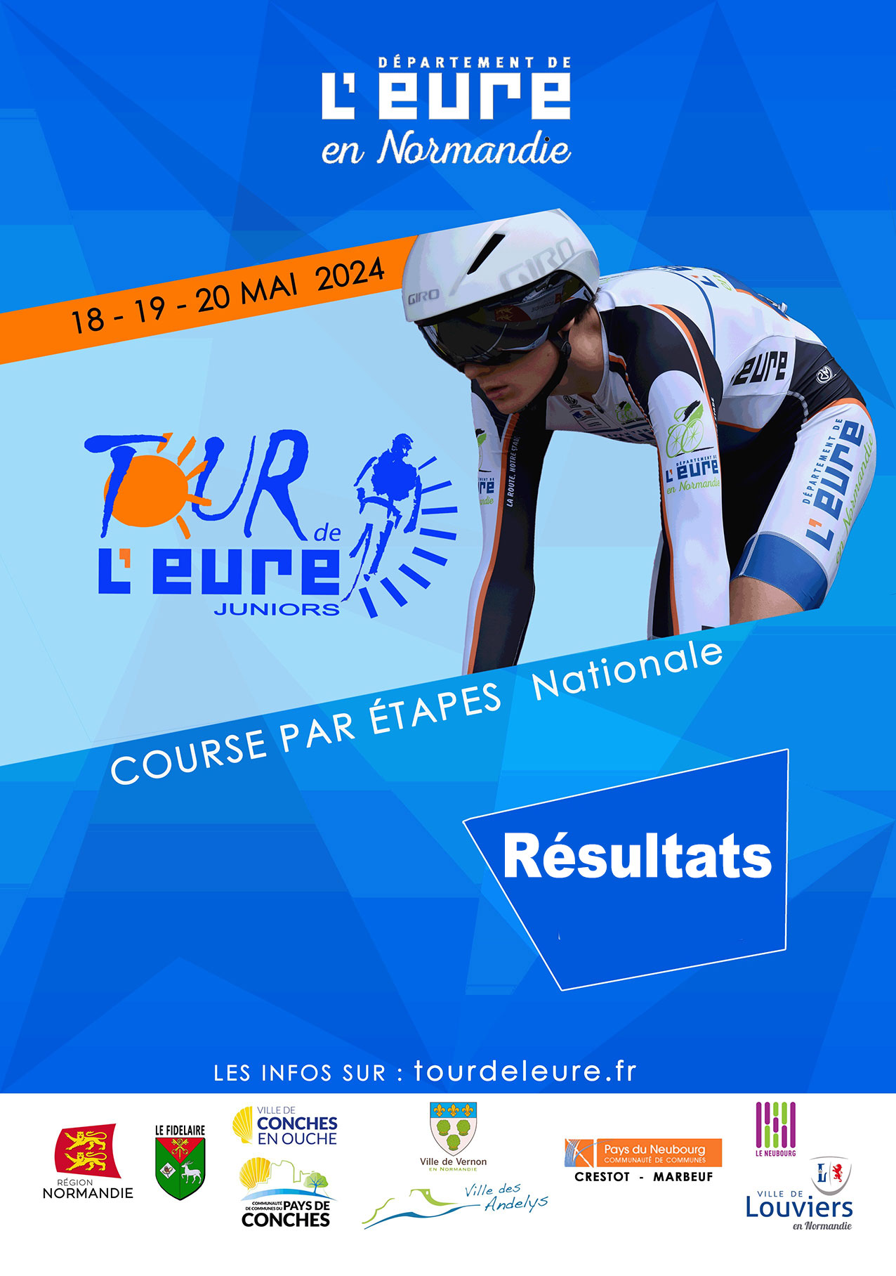 Accueil › Résultats › Résultats - Route Résultats - Route 2024 - Tour de l’Eure Juniors Publié le mardi 14 mai 2024 Mis à jour le lundi 20 mai 2024 par Frédéric Lafargue Liste de départ 1ère étape Le Fidelaire - Conches en Ouche 2ème étape Vernon - Les Andelys 3ème étape Crestot - Marbeuf (CLM-EQ) 4ème étape Le Neubourg - Louviers Accueil Retour à la rubrique